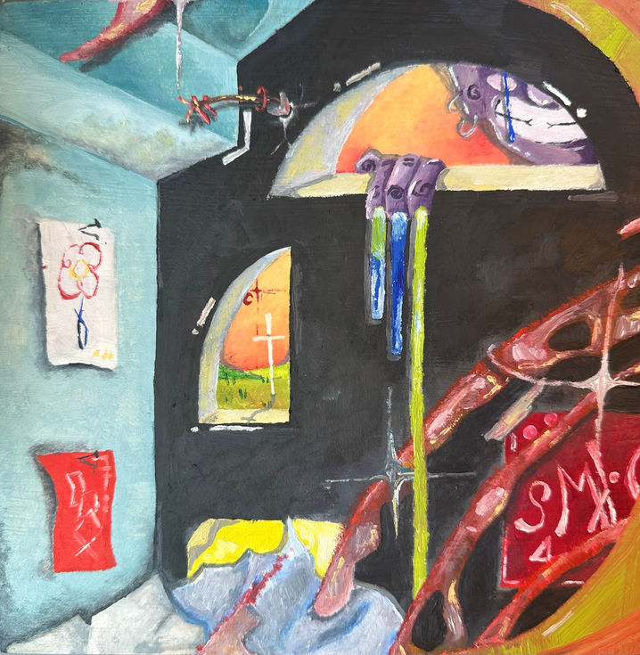 Oil painting done on a gesso primed, wood canvas. The painting is a depiction of my old dorm room, mixed with some of my nightmares. I have never had a good relationship with things like religion and authority, so they watch me through my bedroom walls... even though the bedroom is supposed to be my safe space. But, is it really if you are sharing it with your thoughts?Where does home become? Where am I safe from myself?
